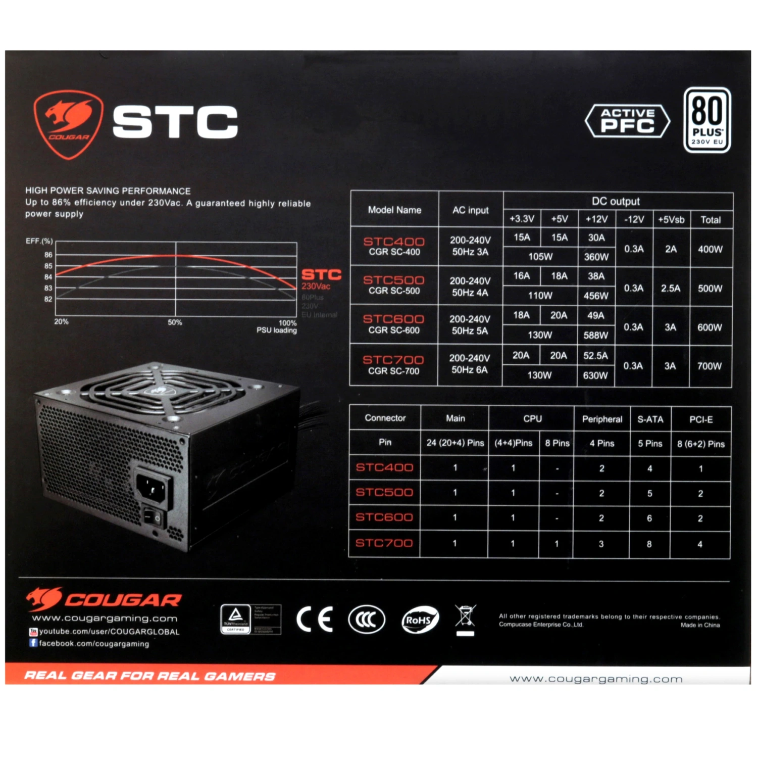 Cougar STC 600 оснащен современными технологиями защиты, такими как OCP, OPP, OVP, SCP и UVP, что делает его безопасным выбором для вашего оборудования. Сертификат 80 PLUS Standard подтверждает высокую эффективность работы блока питания.