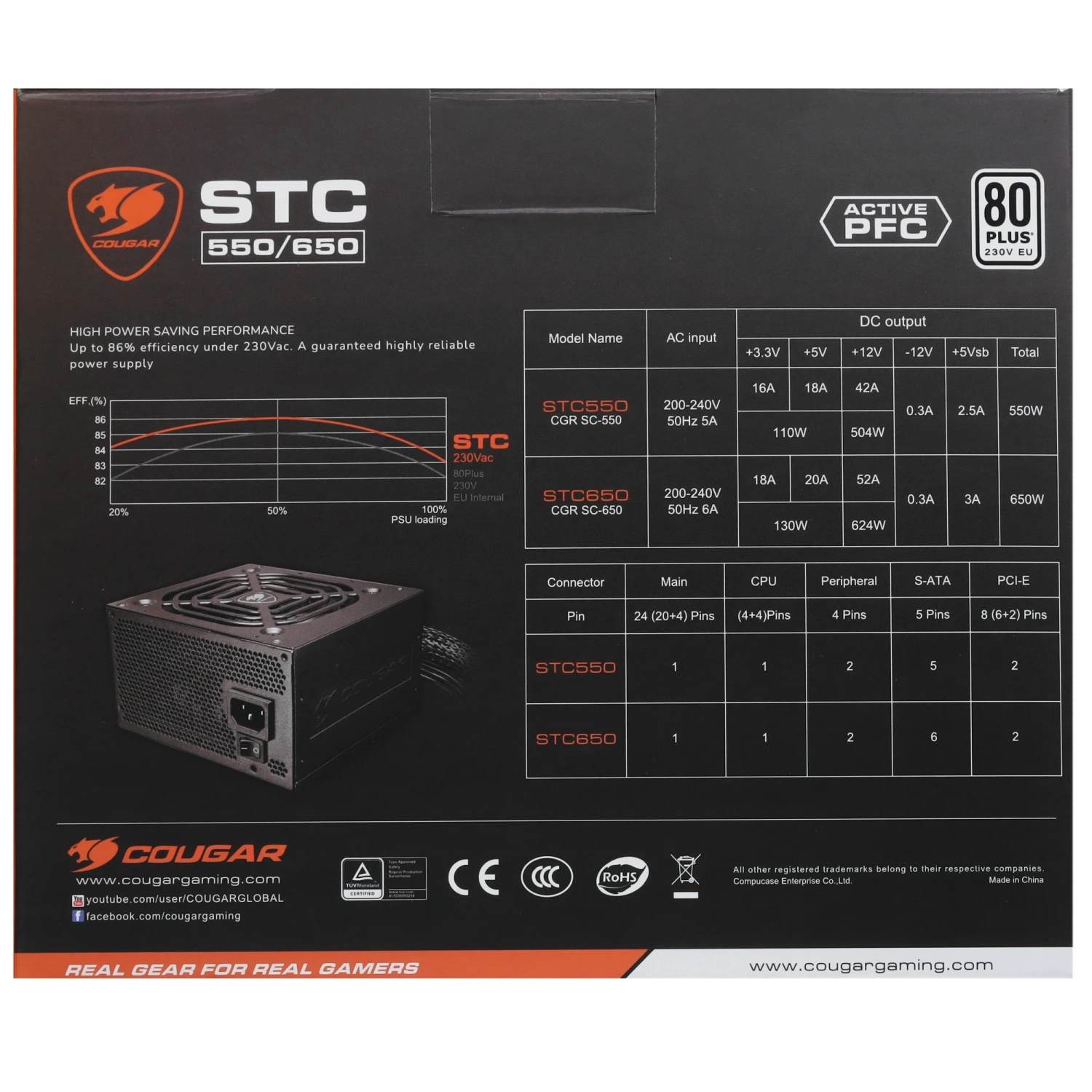 Cougar STC 650 оснащен множеством технологий защиты, включая OCP, OPP, OVP, SCP и UVP, что гарантирует безопасность вашего оборудования и предотвращает возможные повреждения. Японские конденсаторы добавляют надежности и долговечности устройству.