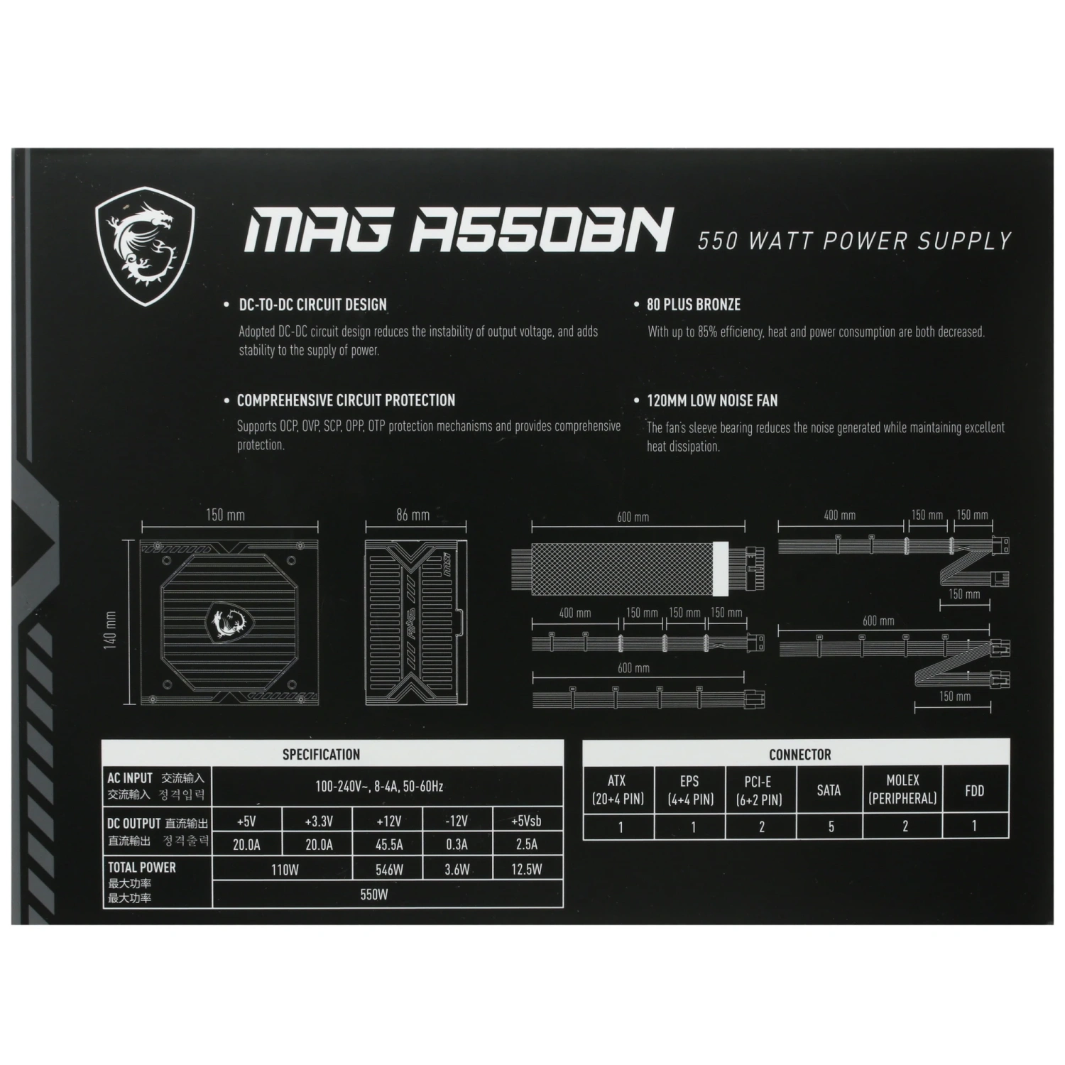 MSI MAG A550BN предлагает не только высокую производительность, но и надежность. Встроенные технологии защиты, такие как OCP, OPP, OTP, OVP и SCP, гарантируют долгий срок службы устройства и защиту ваших компонентов от возможных повреждений. Кроме того, кабели блока питания имеют защитную оплетку, что обеспечивает дополнительную защиту и аккуратный внешний вид.