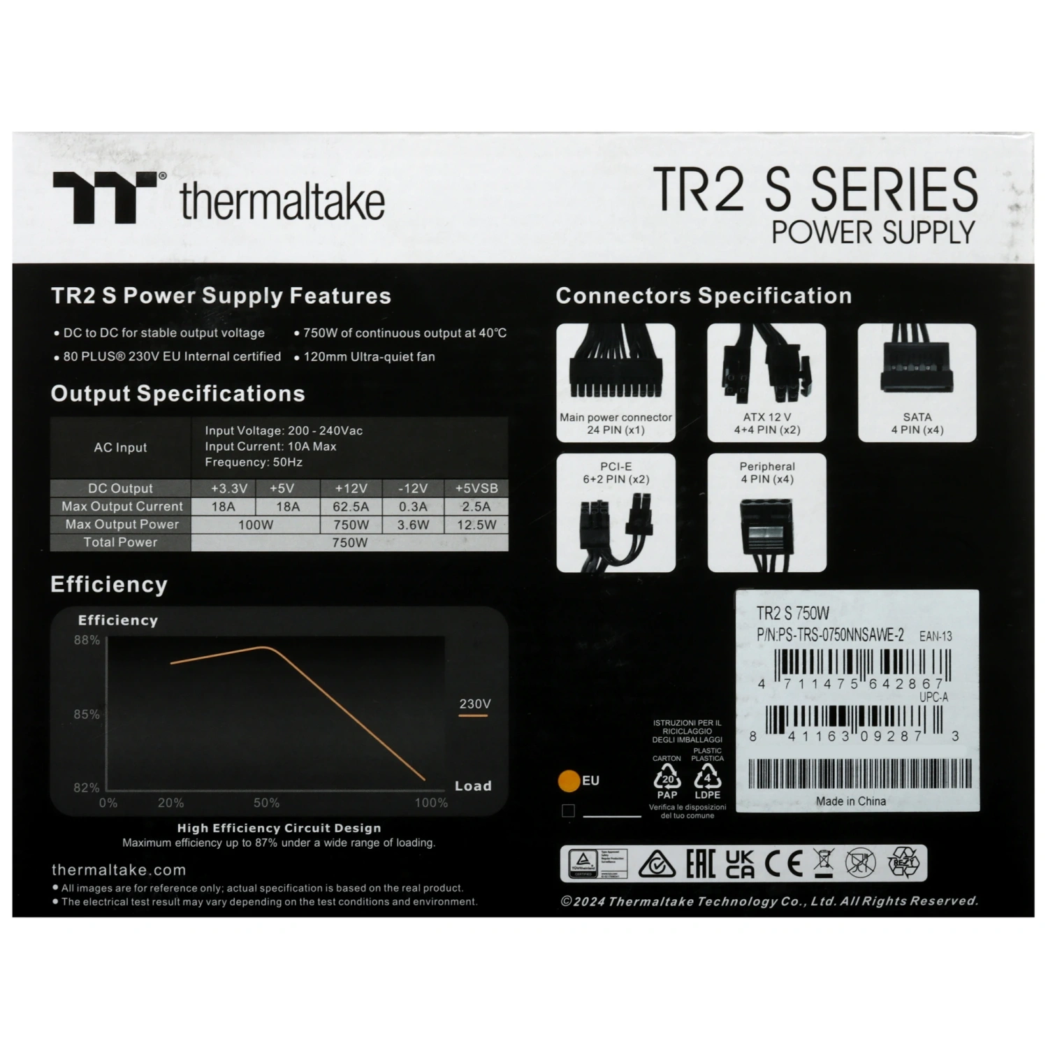 TR2 S 750W предлагает широкий набор разъемов, включая 24-контактный основной разъем питания, два 4+4-контактных разъема для процессора, два 6+2-контактных разъема PCI-E для видеокарт, а также четыре разъема SATA и четыре периферийных разъема Molex. Это делает блок питания универсальным решением для большинства конфигураций, от мощных игровых систем до рабочих станций.