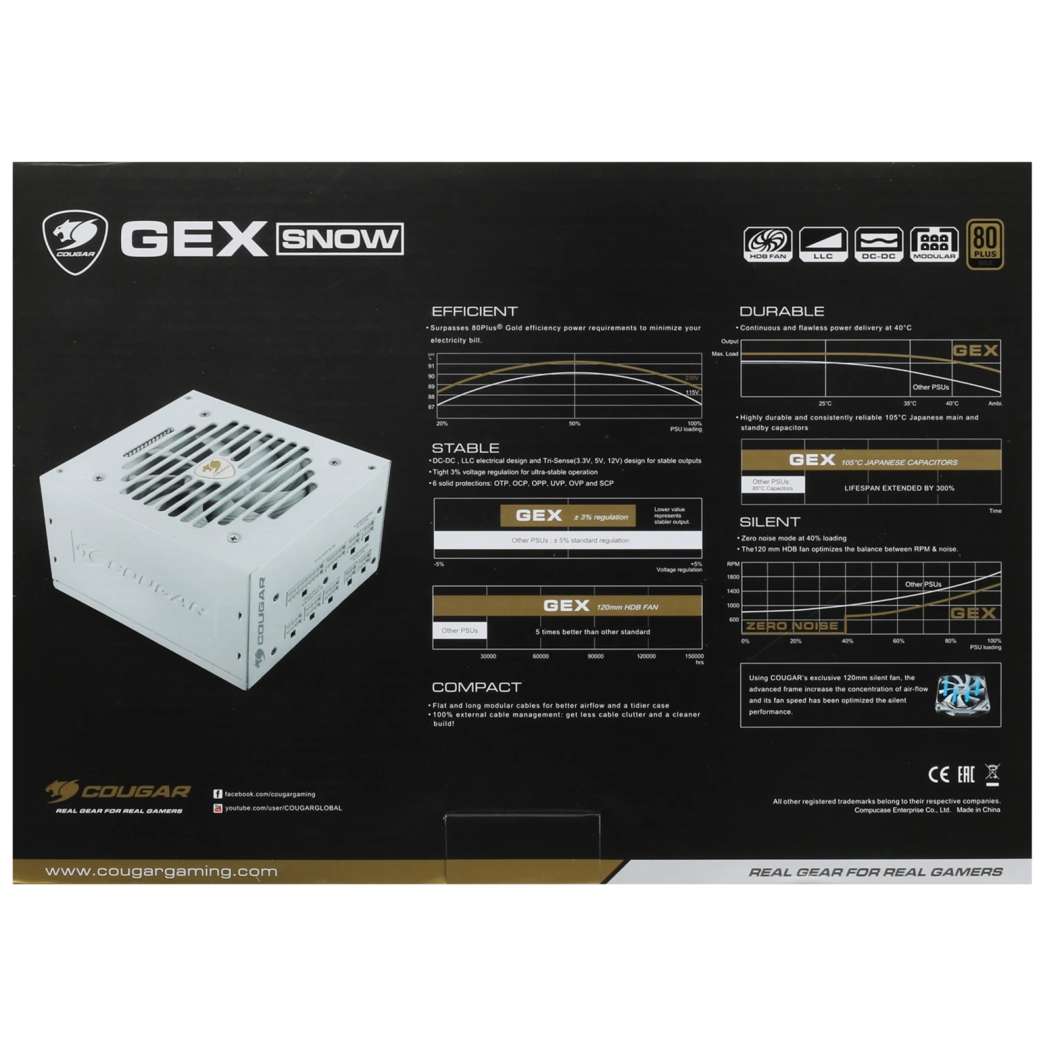 Cougar GEX 850 SNOW оснащен множеством защитных механизмов, включая защиту от перенапряжения, перегрева и короткого замыкания, что гарантирует долговечность и стабильность работы блока питания.