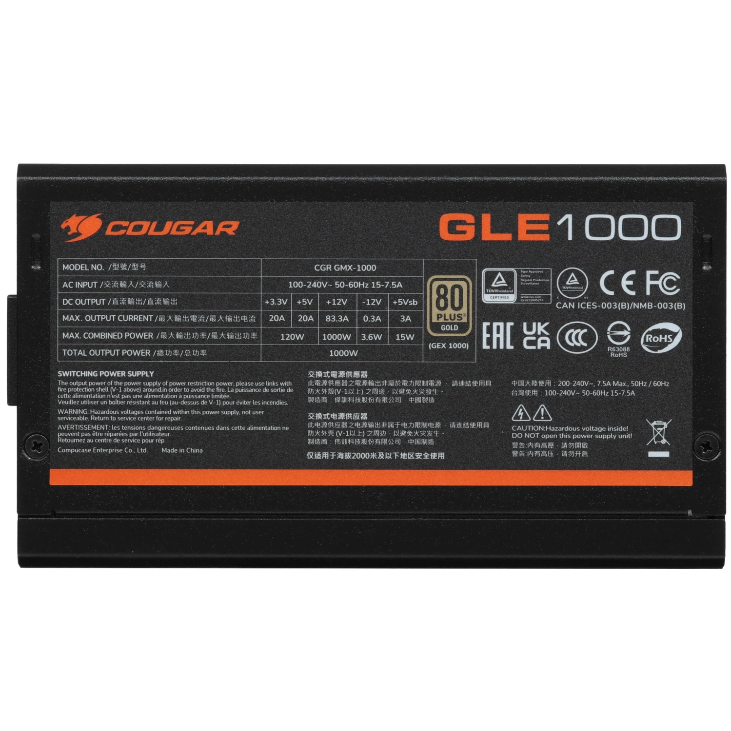 <h2>Характеристики</h2> <ul> <li><strong>Гарантия:</strong> 120 мес.</li> <li><strong>Страна-производитель:</strong> Китай</li> <li><strong>Тип:</strong> блок питания</li> <li><strong>Модель:</strong> Cougar GLE 1000</li> <li><strong>Код производителя:</strong> CGR GMX-1000</li> <li><strong>Мощность (номинал):</strong> 1000 Вт</li> <li><strong>Форм-фактор:</strong> ATX</li> <li><strong>Цвет:</strong> черный</li> <li><strong>Отстегивающиеся кабели:</strong> полностью модульный</li> <li><strong>Оплетка проводов:</strong> индивидуальная тканевая оплетка</li> <li><strong>Цвета проводов:</strong> черные</li> <li><strong>Тип подсветки:</strong> нет</li> <li><strong>Основной разъем питания:</strong> 20+4 pin</li> <li><strong>Разъемы для питания процессора (CPU):</strong> 2 x 4+4 pin</li> <li><strong>Разъемы для питания видеокарты (PCI-E):</strong> 6 x 6+2 pin, 16 pin (12V-2x6)</li> <li><strong>Количество разъемов 15-pin SATA:</strong> 12</li> <li><strong>Количество разъемов 4-pin Molex:</strong> 4</li> <li><strong>Разъем 4 pin Floppy:</strong> нет</li> <li><strong>Длина основного кабеля питания:</strong> 600 мм</li> <li><strong>Длина кабеля питания процессора:</strong> 650 мм</li> <li><strong>Длина кабеля питания PCI-E:</strong> 650 мм</li> <li><strong>Длина кабеля питания SATA:</strong> 500 мм</li> <li><strong>Длина кабеля питания Molex:</strong> 500 мм</li> <li><strong>Мощность по линии 12 В:</strong> 1000 Вт</li> <li><strong>Ток по линии +12 В:</strong> 12V1 83.3A</li> <li><strong>Ток по линии +3.3 В:</strong> 20 А</li> <li><strong>Ток по линии +5 В:</strong> 20 А</li> <li><strong>Ток дежурного источника (+5 В Standby):</strong> 3 А</li> <li><strong>Ток по линии -12 В:</strong> 0.3 А</li> <li><strong>Диапазон входного напряжения сети:</strong> 100-240 В 50/60 Гц</li> <li><strong>Система охлаждения:</strong> активная</li> <li><strong>Размеры вентиляторов:</strong> 135 x 135 мм</li> <li><strong>Регулировка оборотов:</strong> автоматическая</li> <li><strong>Переключатель режима работы вентилятора (Hybrid mode):</strong> нет</li> <li><strong>Сертификат 80 PLUS:</strong> Gold</li> <li><strong>Корректор коэффициента мощности (PFC):</strong> активный</li> <li><strong>Соответствие стандартам:</strong> ATX 12V 3.1</li> <li><strong>Технологии защиты:</strong> OCP, OPP, OTP, OVP, SCP, UVP</li> <li><strong>Сетевой кабель в комплекте:</strong> есть</li> <li><strong>Комплектация:</strong> документация, комплект кабелей, комплект крепежа</li> <li><strong>Ширина:</strong> 150 мм</li> <li><strong>Высота:</strong> 86 мм</li> </ul>