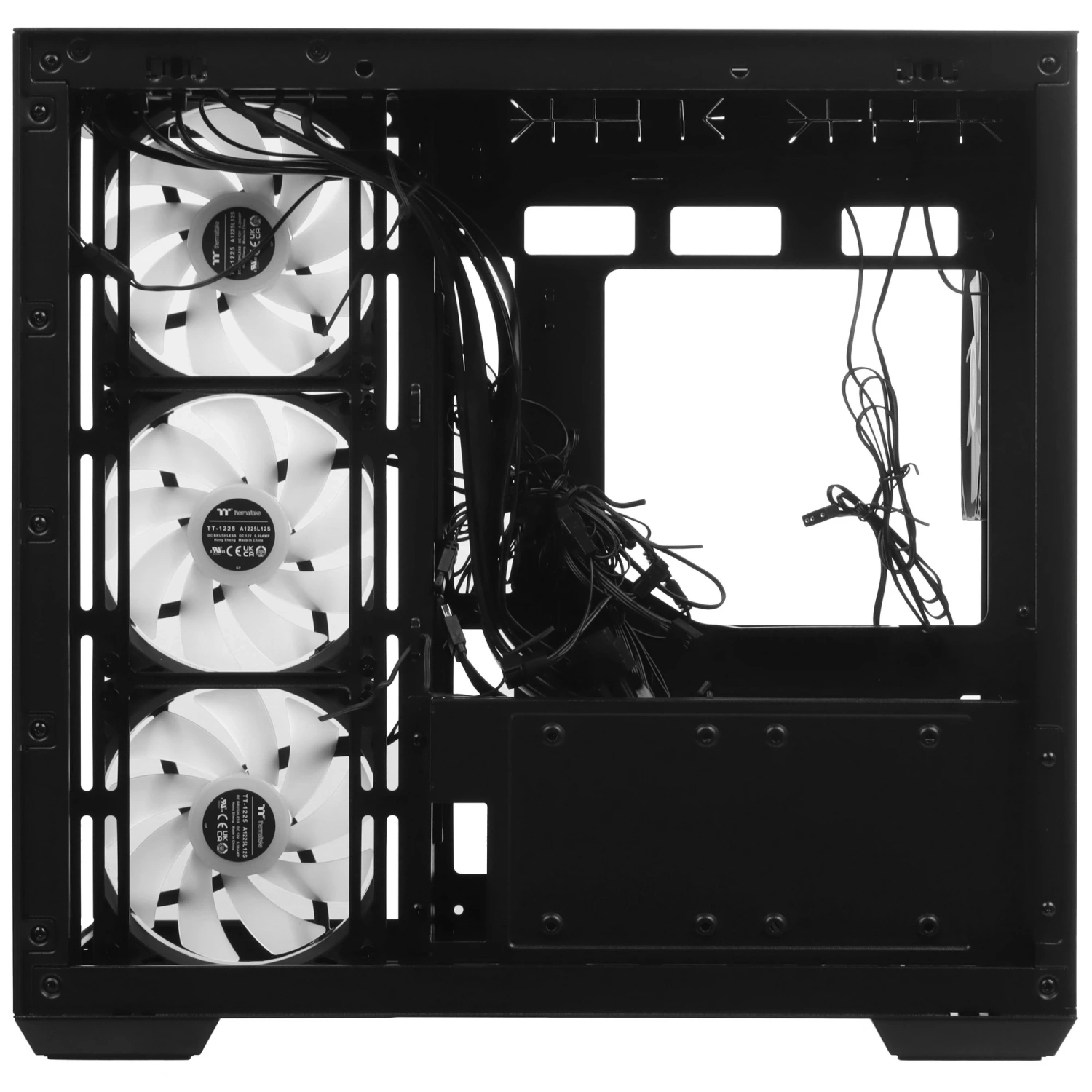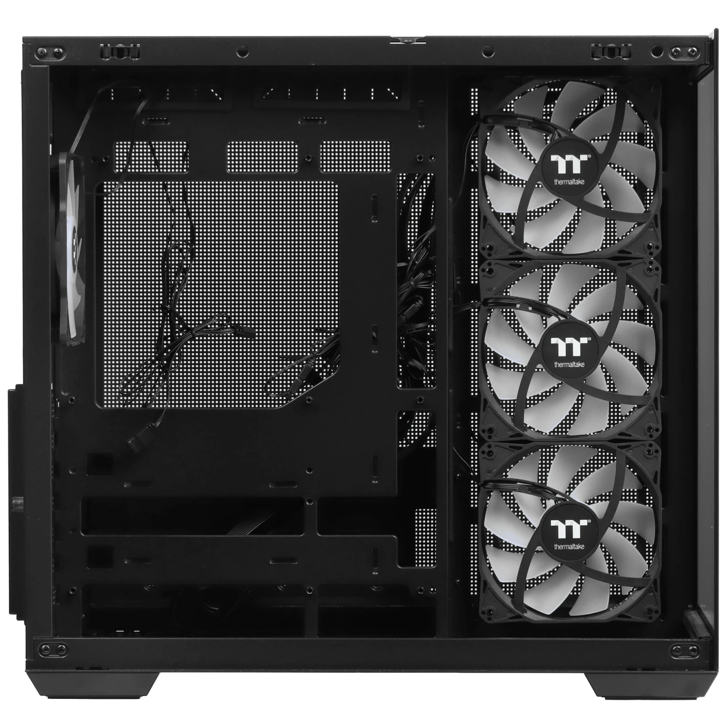 Внутри Thermaltake View 380 TG ARGB предусмотрено достаточно места для установки до десяти 120 мм вентиляторов и радиаторов длиной до 360 мм. В комплекте уже имеется предустановленный вентилятор 120 ARGB Lite Fan, который можно синхронизировать с материнскими платами ASUS, GIGABYTE, MSI или ASRock, имеющими 5V интерфейс для подключения адресных светодиодов. Это позволяет вам легко управлять подсветкой и создавать эффектные световые эффекты.