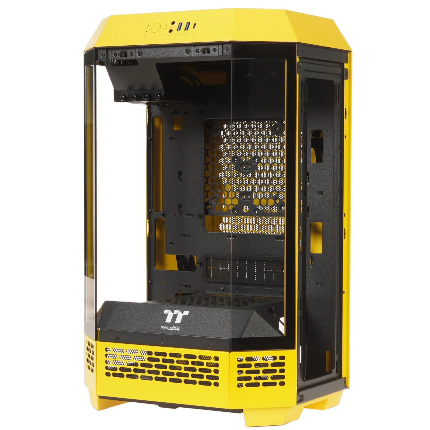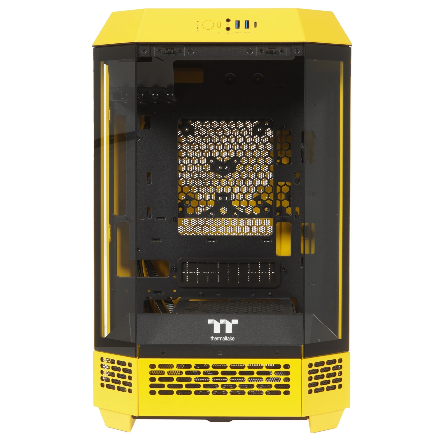 Thermaltake The Tower 300 Bumblebee поддерживает материнские платы формата Mini-ITX и Micro-ATX, а также блоки питания ATX. В верхней части корпуса расположены удобные разъемы USB 3.2 Gen 1 Type-A и USB 3.2 Gen 2 Type-C, что обеспечивает быстрый доступ к необходимым портам.