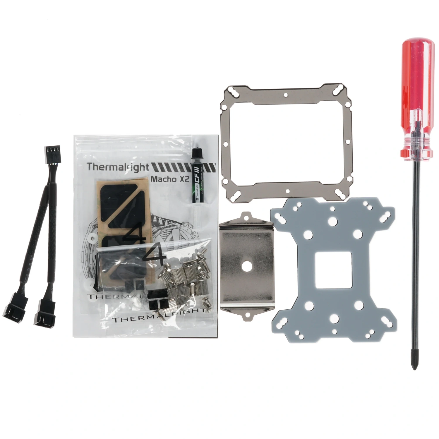 В комплект поставки входят все необходимые элементы: монтажный набор, Y-кабель и термопаста в отдельной емкости. Thermalright Macho X2 LE совместим с множеством сокетов, включая AM2, AM4, LGA 1200 и многие другие, что делает его универсальным решением для различных платформ.