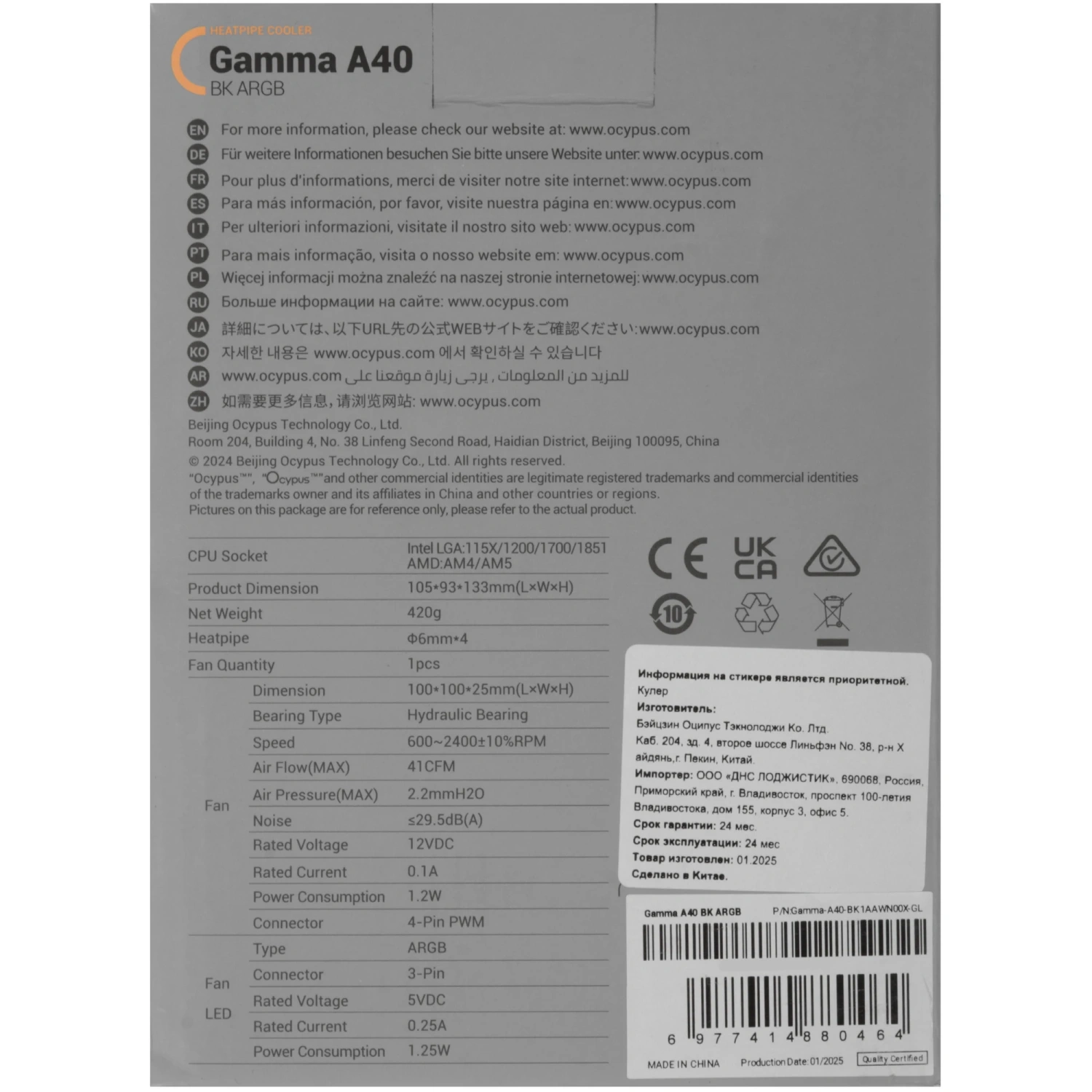 - Модель: Ocypus Gamma A40 BK ARGB