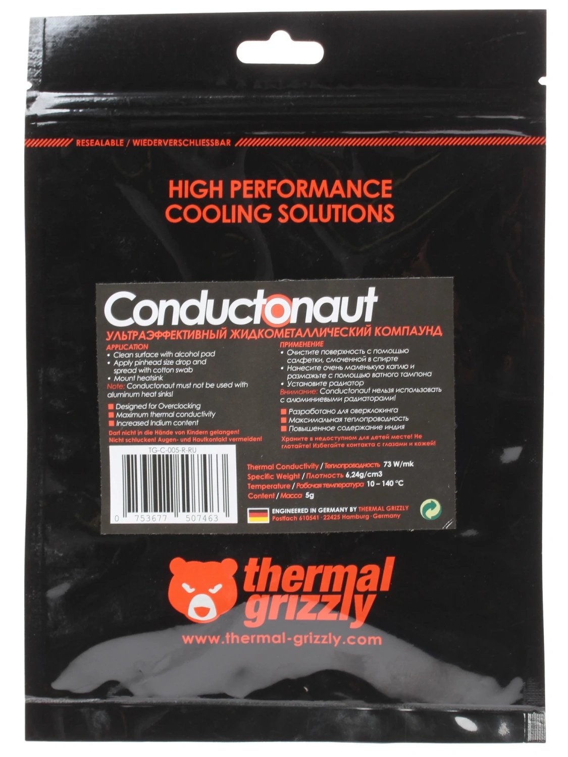 Thermal Grizzly Conductonaut поставляется в удобном шприце объемом 5 г, что делает процесс нанесения простым и точным. В комплект входят апликаторы и обезжиривающая салфетка, что позволяет вам легко подготовить поверхность и добиться идеального контакта между процессором и кулером.