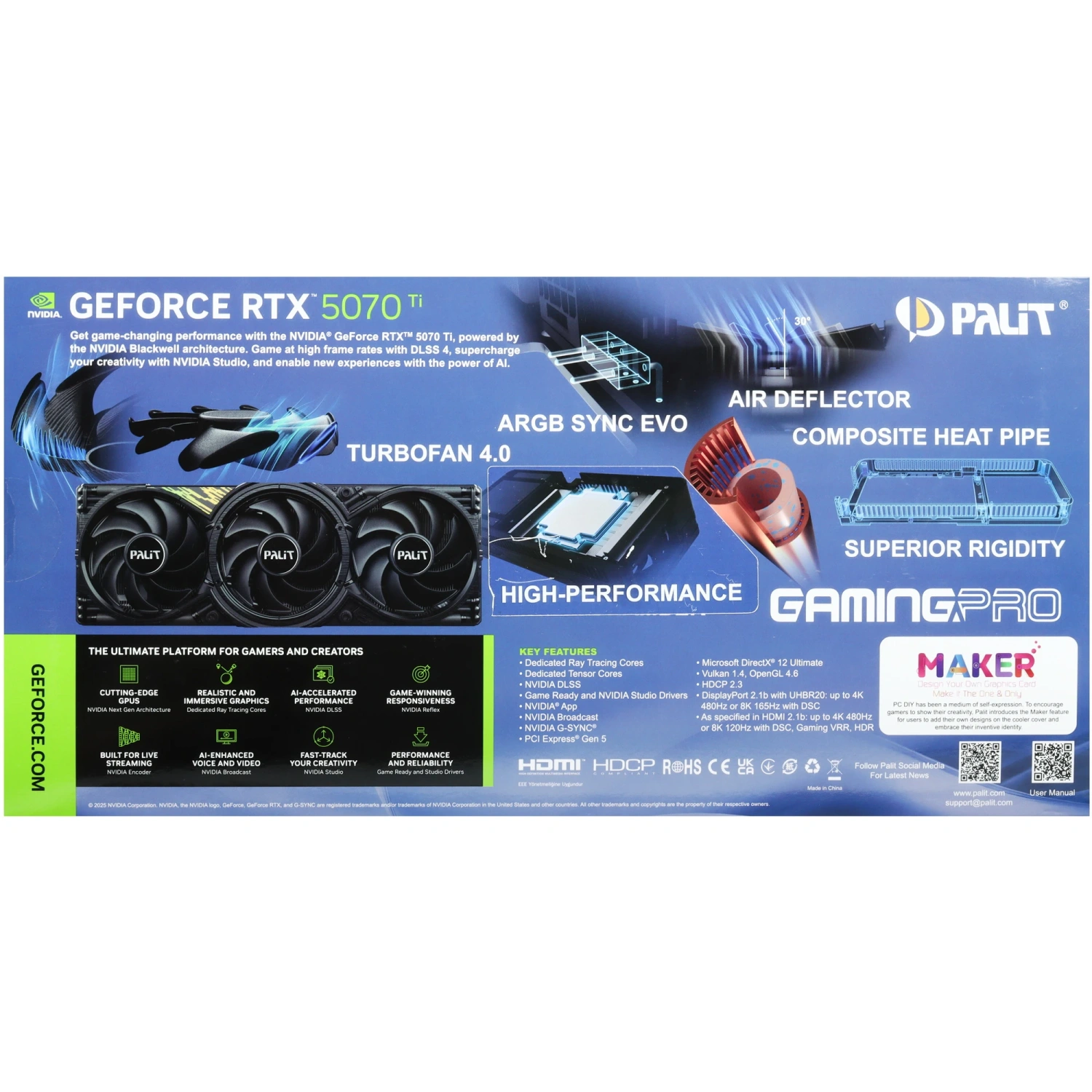 Погрузитесь в мир высококачественной графики с видеокартой Palit GeForce RTX 5070 Ti GamingPro V1. Эта мощная игровая видеокарта, оснащенная стильной RGB-подсветкой и тремя высокопроизводительными кулерами, обеспечит вам невероятные впечатления от игр и мультимедиа. С 16 ГБ GDDR7 памяти вы сможете без труда подключить до четырех мониторов и наслаждаться просмотром видео в формате 8K Ultra HD без каких-либо задержек и зависаний.