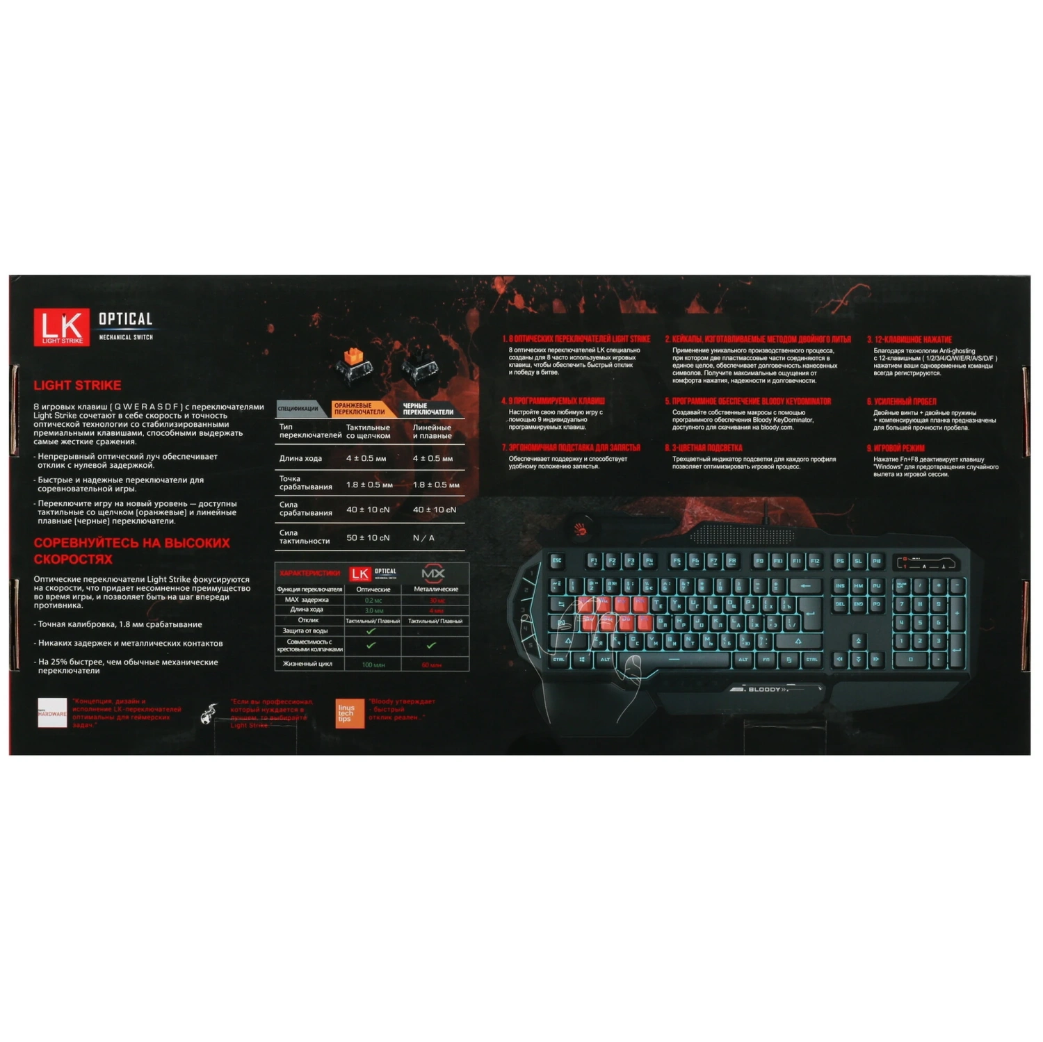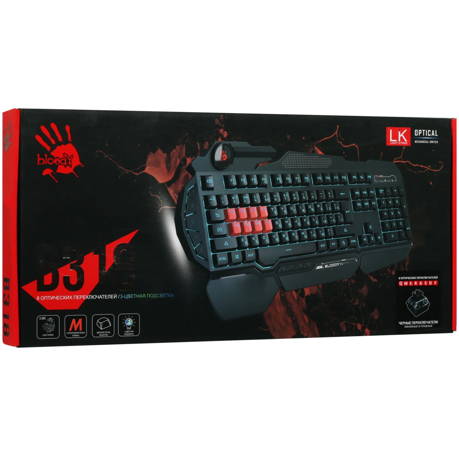 Полноразмерная A4Tech Bloody B318 включает 113 клавиш, среди которых 9 программируемых макро-клавиш, позволяющих настроить управление под свои нужды. Благодаря многоцветной подсветке клавиш, вы сможете создать уникальную атмосферу во время игры, а также легко находить нужные клавиши в темноте.