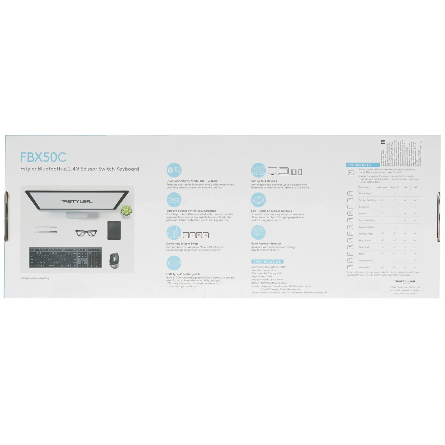 С 109 клавишами, включая цифровой блок и функциональные клавиши, вы получите полный набор для эффективной работы. Удобные дополнительные клавиши для переключения Bluetooth-каналов позволяют быстро и легко подключать до четырех устройств одновременно, что делает A4Tech Fstyler FBX50C идеальным выбором для многозадачности.