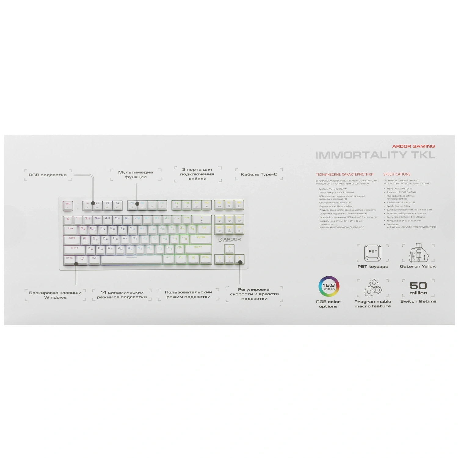Клавиатура ARDOR GAMING Immortality TKL легко подключается к вашему устройству с помощью 1.8-метрового USB-кабеля. Высокая степень защиты корпуса гарантирует устойчивость к влаге, а программируемые клавиши позволят настроить управление под свои предпочтения. Кейкапы из прочного PBT не только долговечны, но и сохраняют яркость цвета на протяжении всего срока службы.