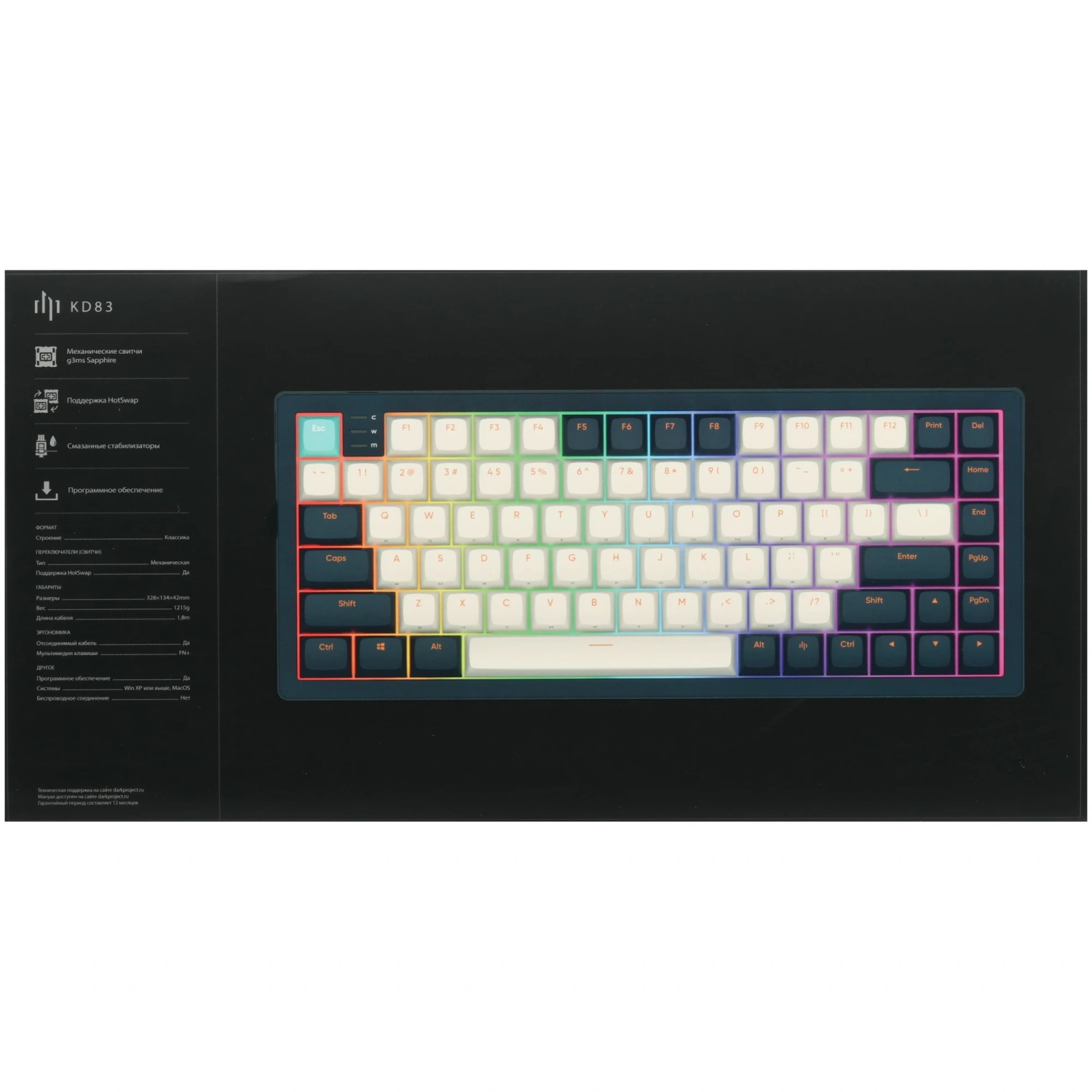 Отсутствие цифрового блока позволяет сэкономить место на рабочем столе, а современный дизайн с RGB-подсветкой не только добавляет эстетики, но и помогает избежать ошибок при вводе. 83 клавиши с яркой подсветкой обеспечивают отличную видимость даже в условиях низкой освещенности.