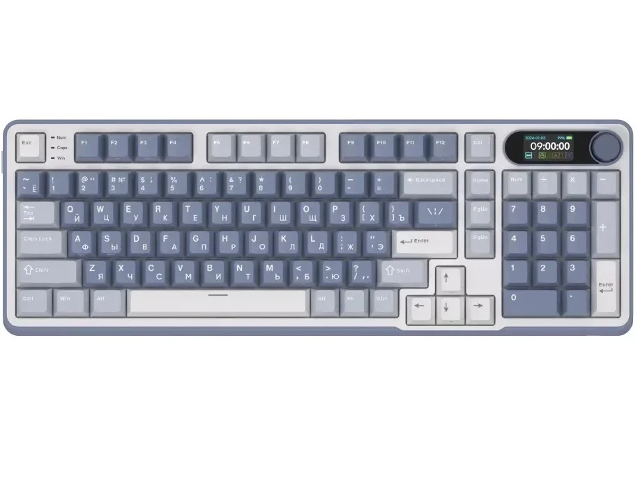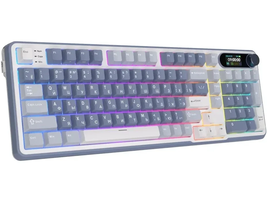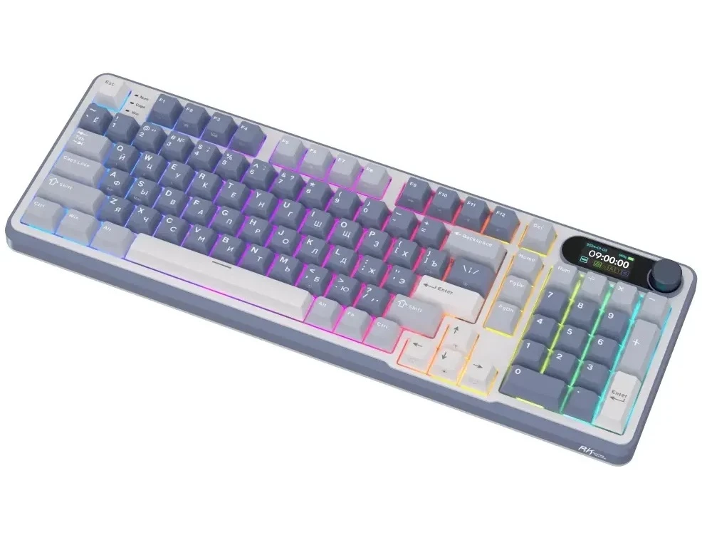 На встроенном LCD-дисплее отображаются основные параметры работы клавиатуры, что позволяет вам всегда быть в курсе текущих настроек. Поворотный механизм для переключения режимов и регулировки громкости добавляет удобства в использовании.