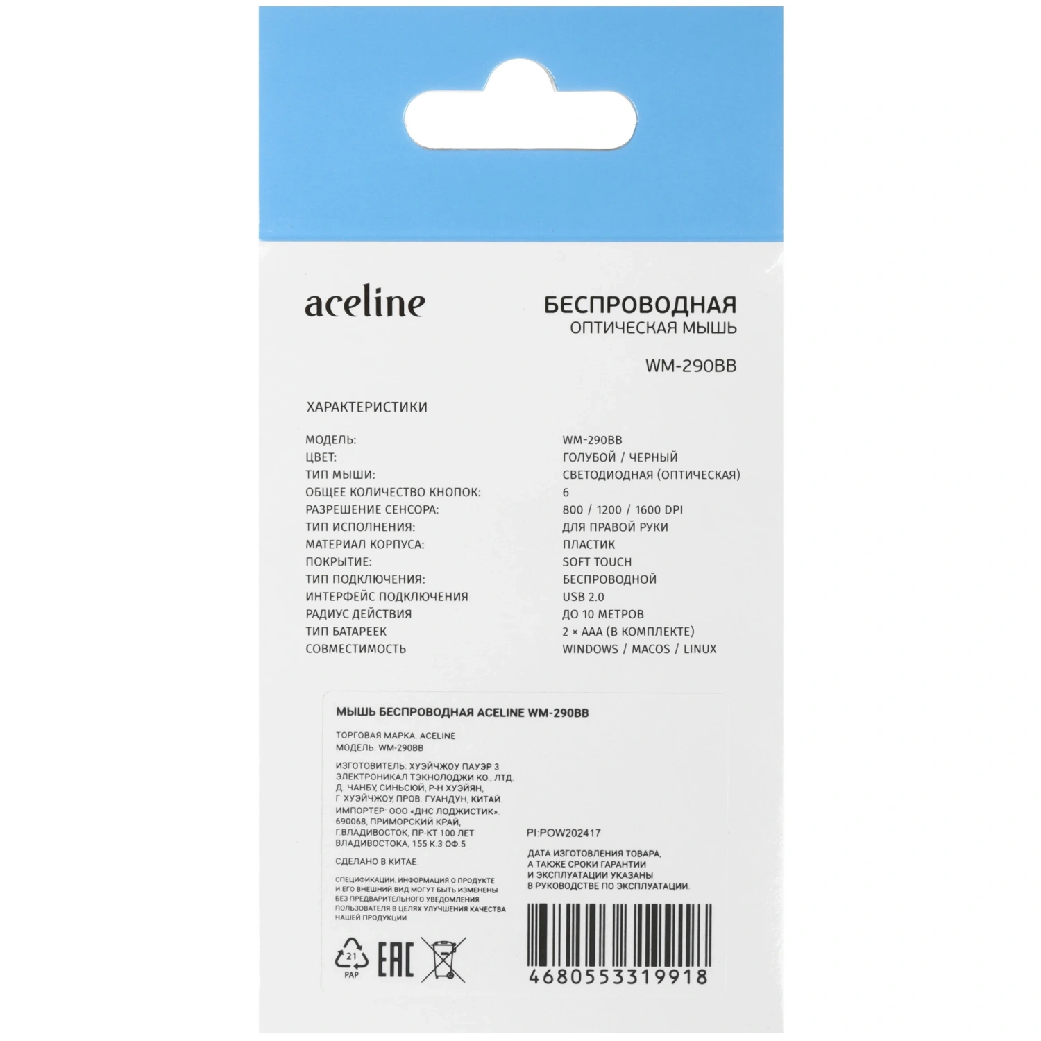 Представляем вам беспроводную мышь Aceline WM-290BB в стильном голубом цвете — устройство, которое сочетает в себе удобство и функциональность. Эргономичный дизайн этой мыши обеспечивает комфорт даже при длительном использовании, позволяя вам сосредоточиться на задачах без лишнего напряжения. Независимо от того, работаете ли вы в офисе или учитесь дома, Aceline WM-290BB станет вашим надежным спутником.