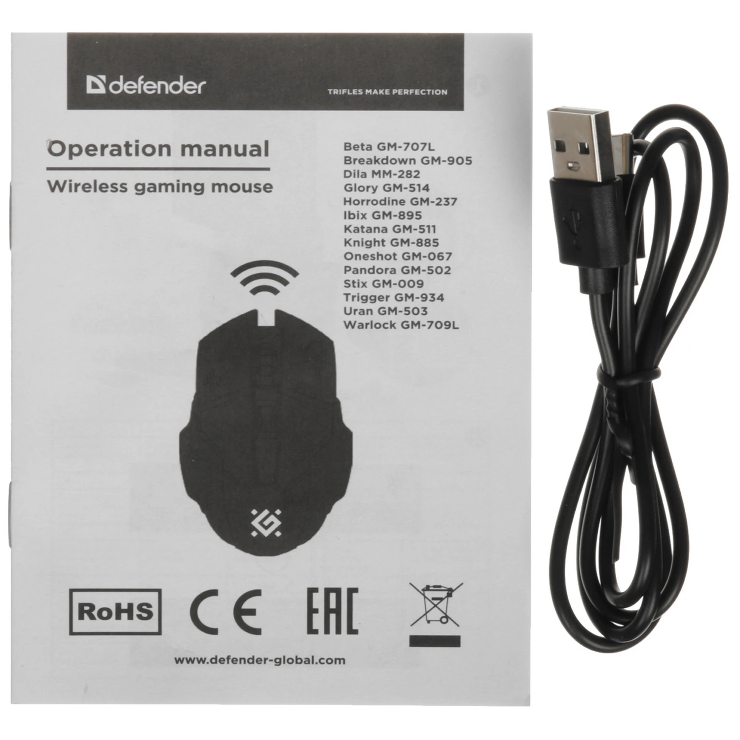 - Комплектация: USB-ресивер, документация, кабель для зарядки