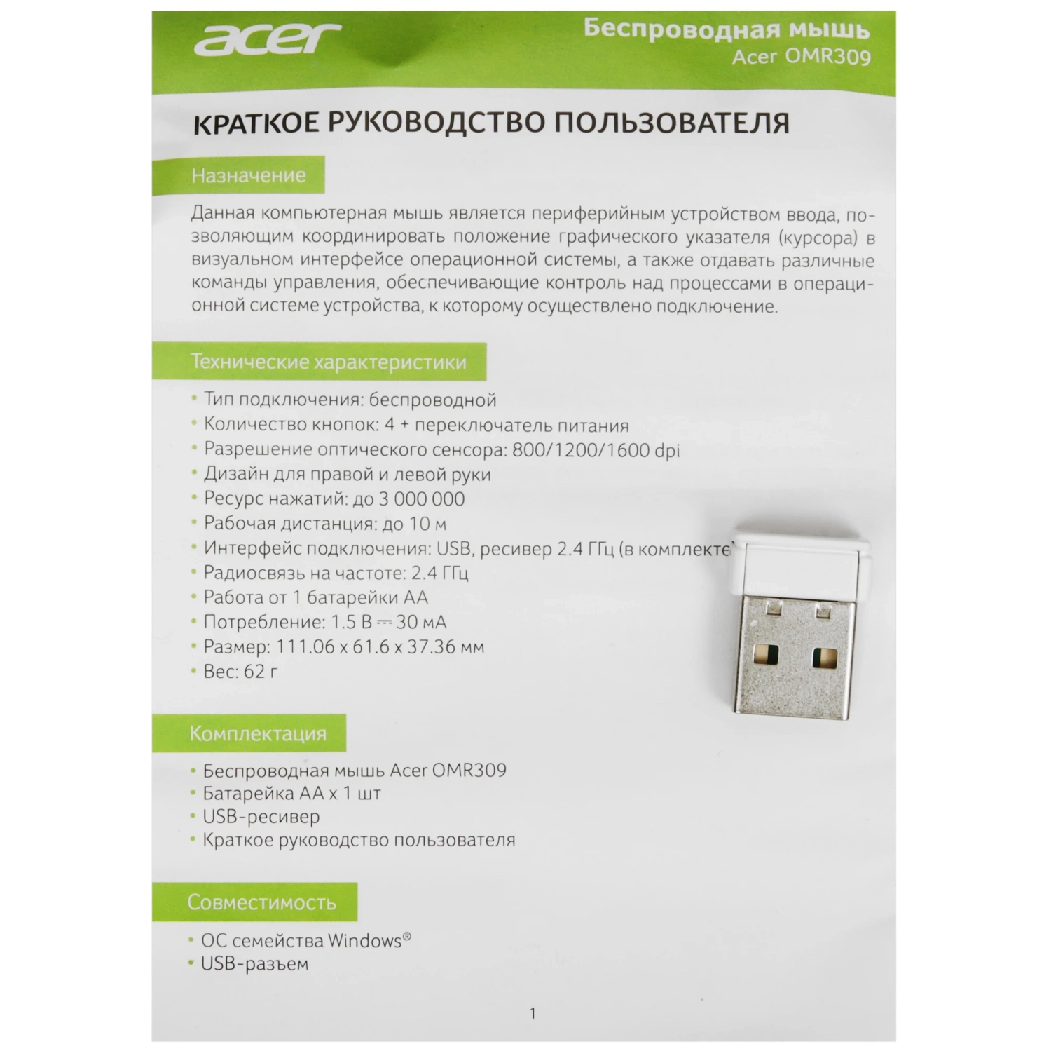 - Комплектация: USB-ресивер, батарейка AA, документация