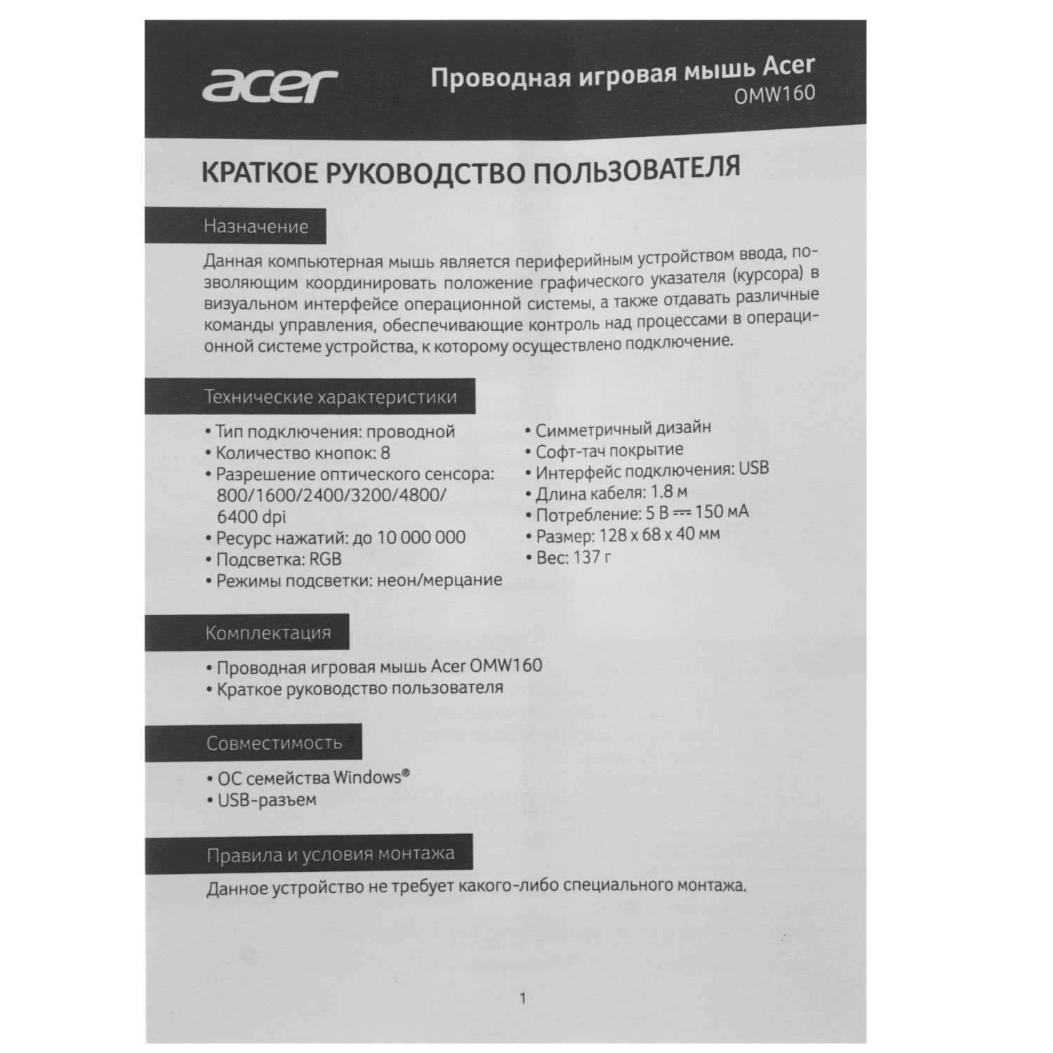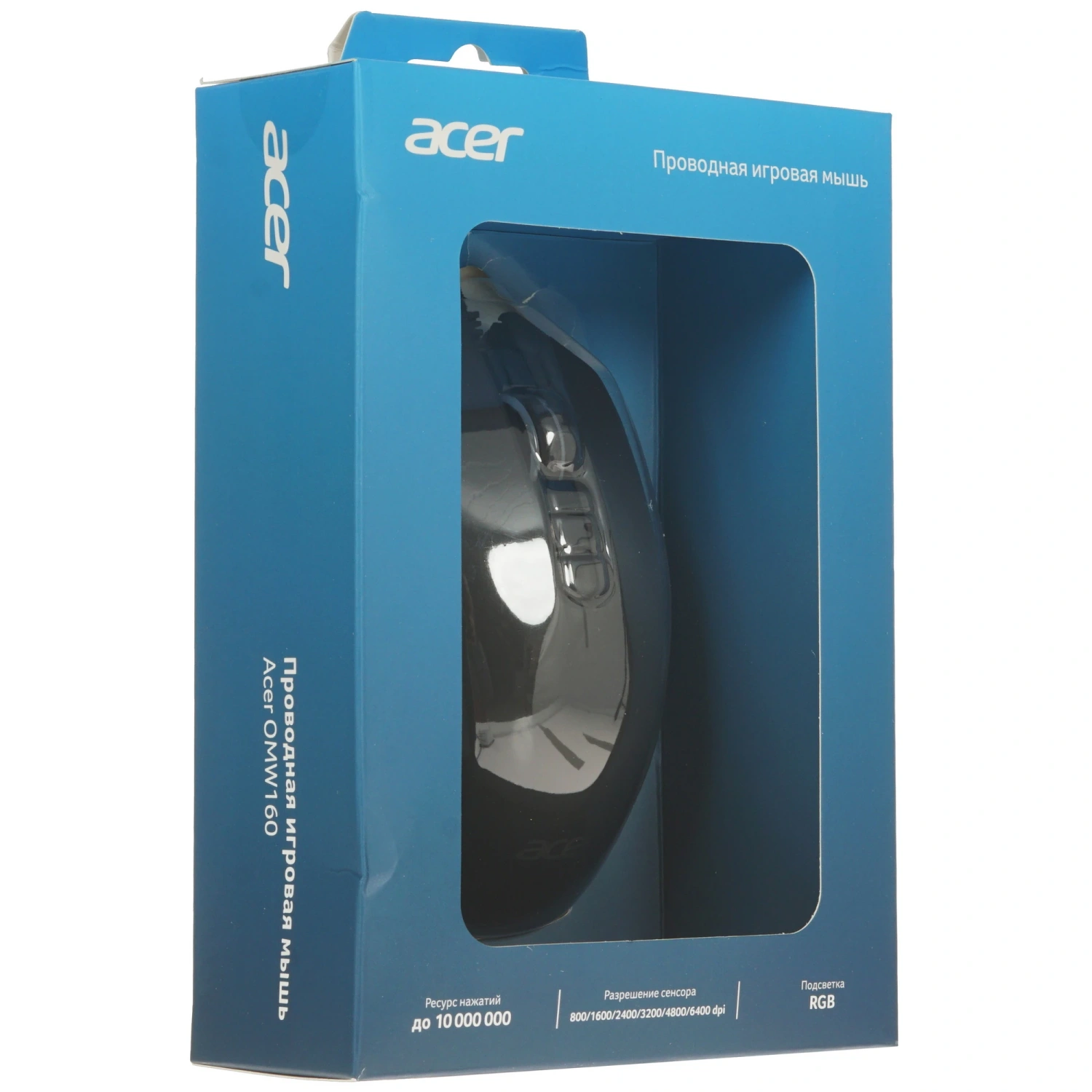 С мышью Acer OMW160 вы забудете о проблемах с подключением. Длина USB-кабеля в 1.8 метра, заключенного в прочную тканевую оплетку, обеспечивает надежность и долговечность, защищая его от истирания. Оптический светодиодный сенсор с максимальным разрешением 6400 dpi гарантирует плавную работу на любых поверхностях, кроме зеркальных, что избавляет вас от необходимости использовать коврик.