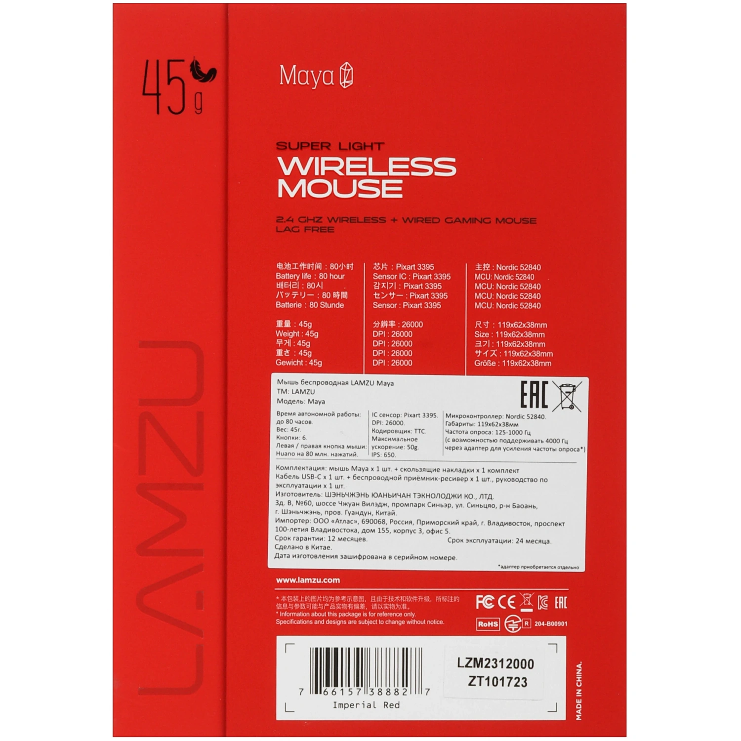 Представляем вам беспроводную/проводную мышь LAMZU Maya в стильном красном цвете — идеальный игровой манипулятор, который сочетает в себе легкость и высокую производительность. С весом всего 45 г, эта мышь обеспечивает комфорт при длительных игровых сессиях, не утомляя вашу руку.
